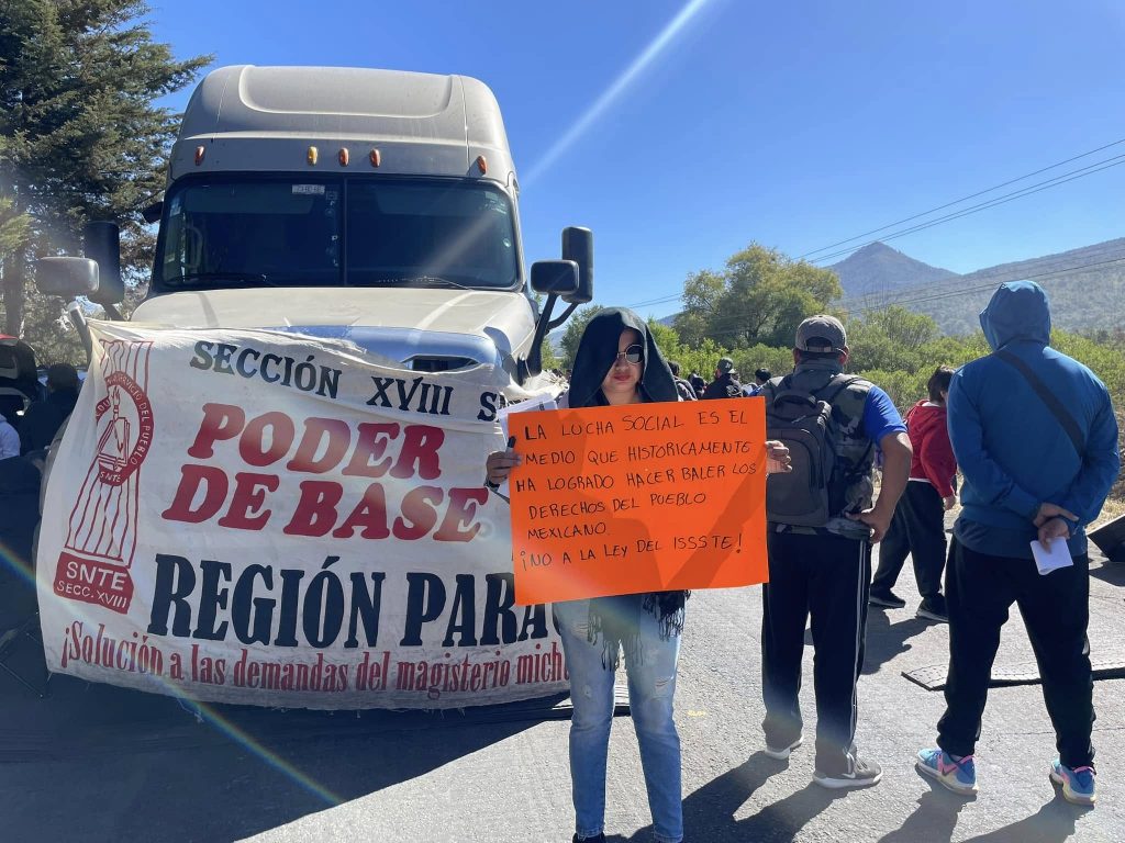 En rechazo a la reforma de la Ley del ISSSTE, integrantes de la Coordinadora Nacional de Trabajadores de la Educación (CNTE) realizaron bloqueos viales y tomaron casetas en al menos 9 regiones de Michoacán.