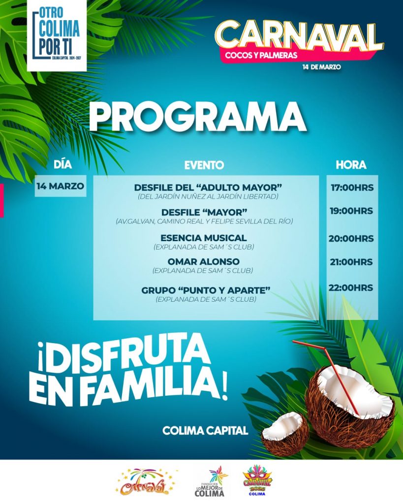 El presidente municipal de Colima, Riult Rivera Gutiérrez, dio a conocer que se modificaron las fechas en que se desarrollará el Carnaval Capital Colima 2025, “Cocos y Palmeras” y anunció que todos los eventos se realizarán solamente durante el viernes 14 de marzo.