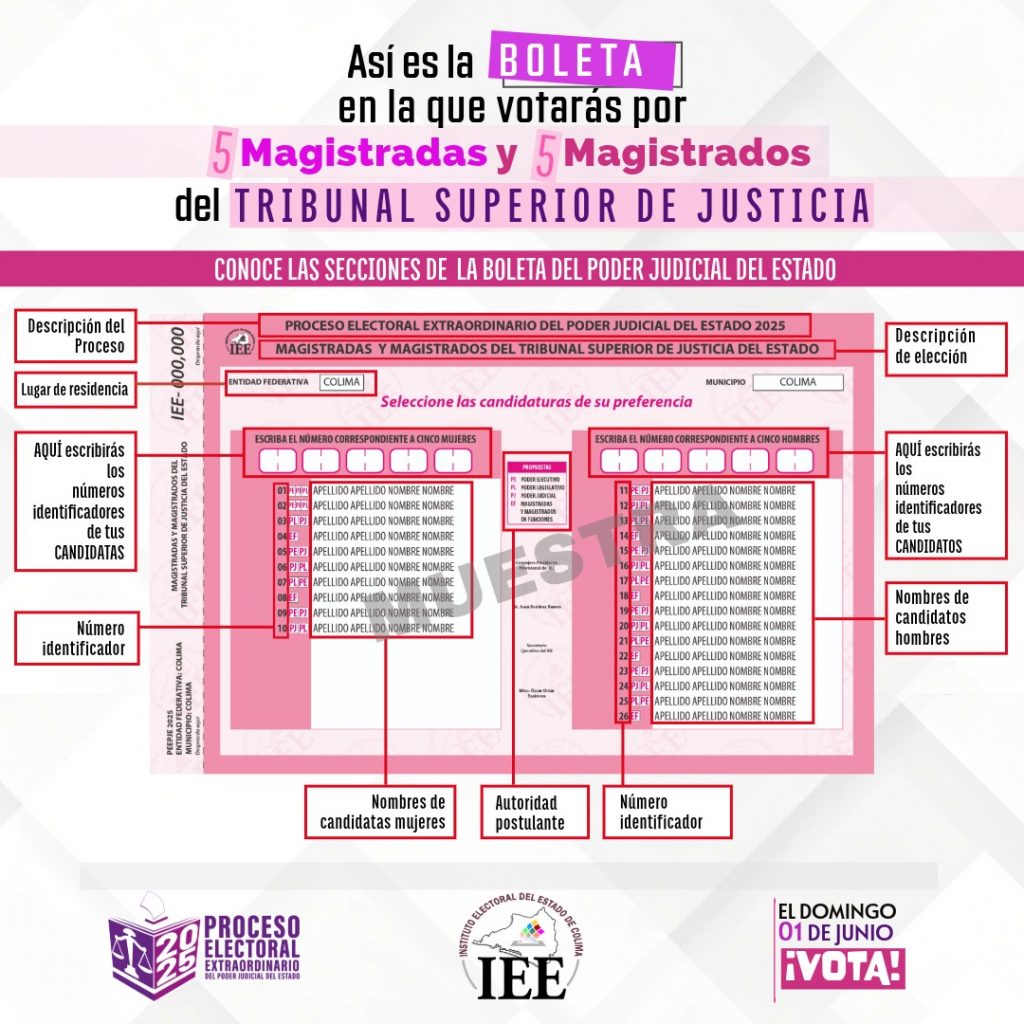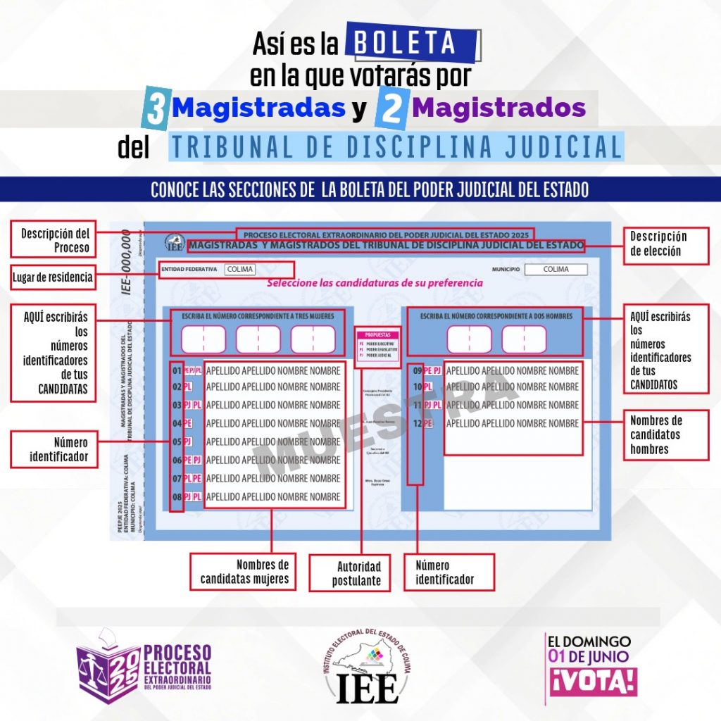 Con el objetivo de que la ciudadanía se prepare con mucha anticipación para votar de manera informada el domingo 1 de junio de este año, el Instituto Electoral del Estado de Colima (IEE) lanzó una campaña de difusión de las boletas muestras de cada una de las 3 elecciones locales del Poder Judicial: magistraturas del Tribunal Superior de Justicia y del Tribunal de Disciplina Judicial y Judicaturas de Primera Instancia.
