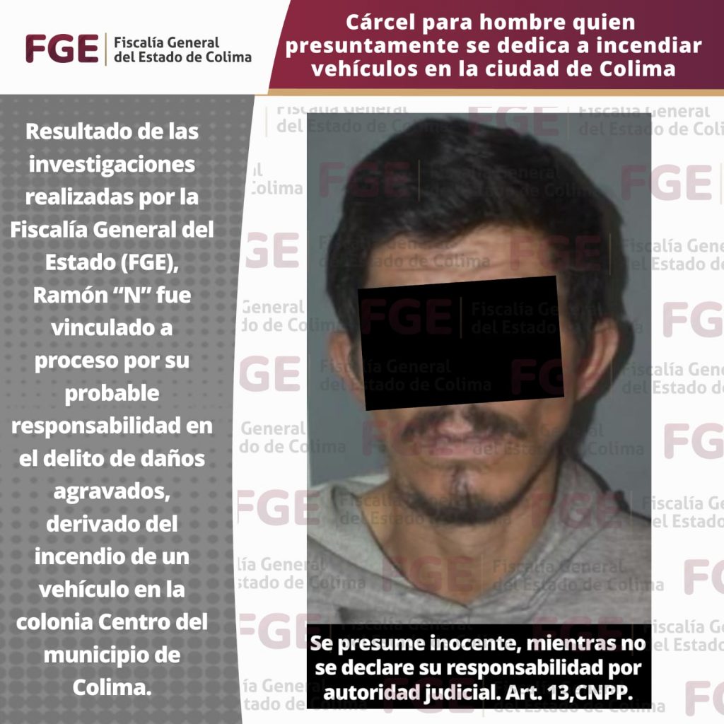 Resultado de las investigaciones realizadas por la Fiscalía General del Estado (FGE), Ramón “N” fue vinculado a proceso por su probable responsabilidad en el delito de daños agravados, derivado del incendio de un vehículo en la colonia Centro del municipio de Colima.