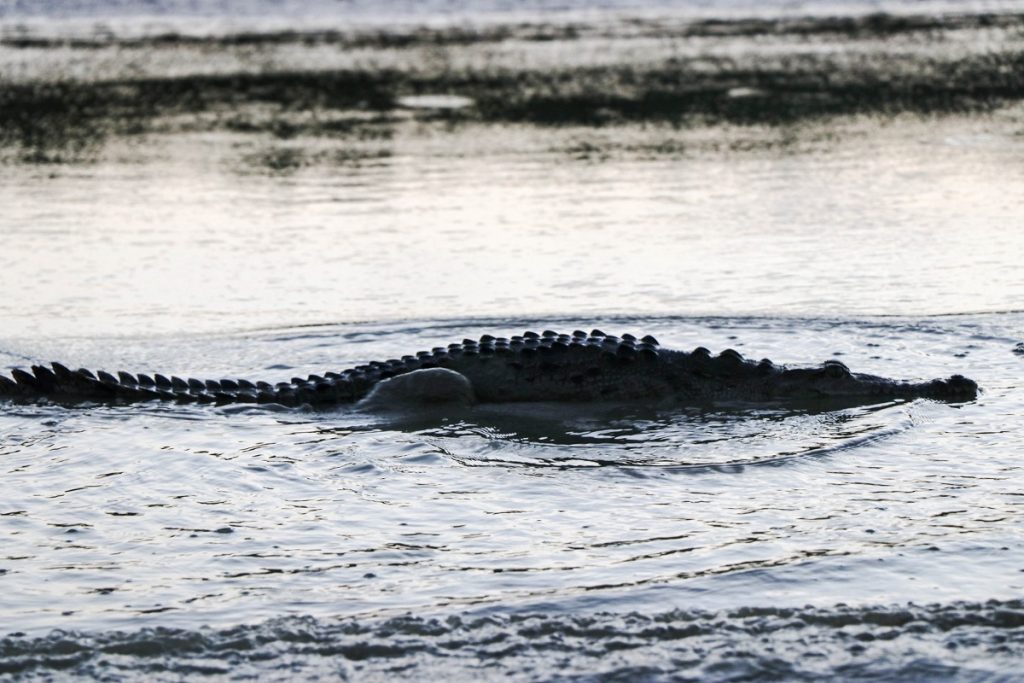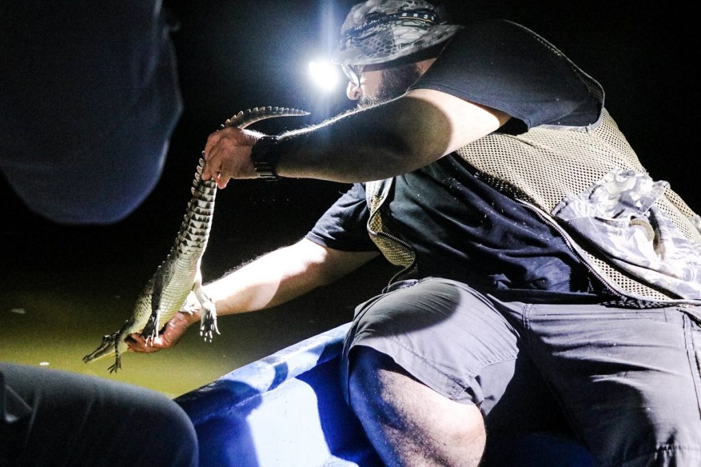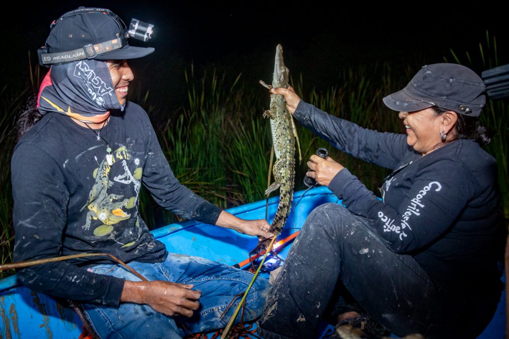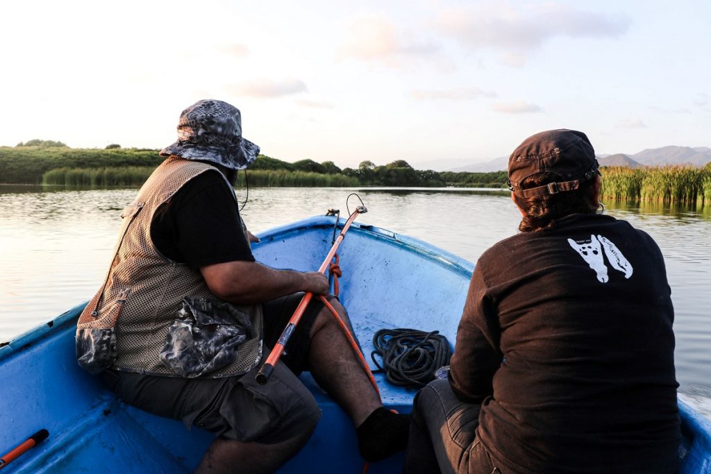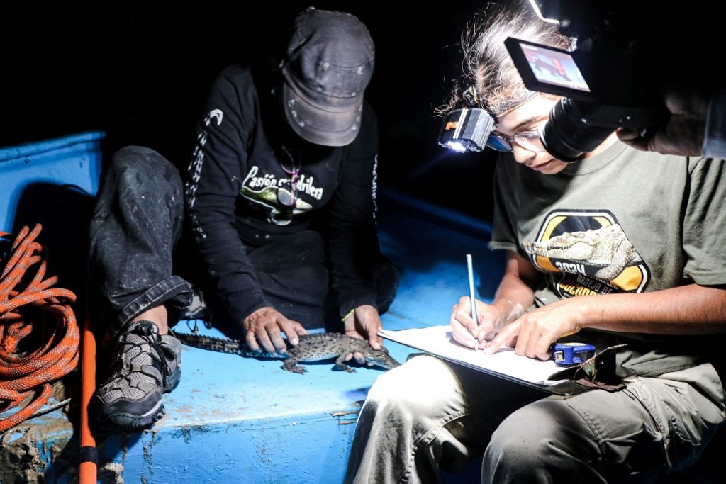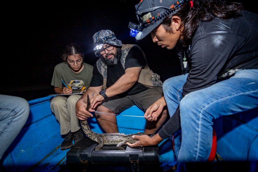 Una vez en las lanchas, el equipo de expertos, expertas y estudiantes se dedicó a la observación, registro y análisis de la población de estos reptiles en su hábitat natural. Durante la jornada, la noche fría, oscura y sin luna sirvió de cobijo para los excursionistas. A la intemperie, en plena laguna, lograron avistar más de 30 cocodrilos de río (Crocodylus acutus) flotando en el agua, con los ojos ligeramente rojos asomando justo sobre la superficie.
