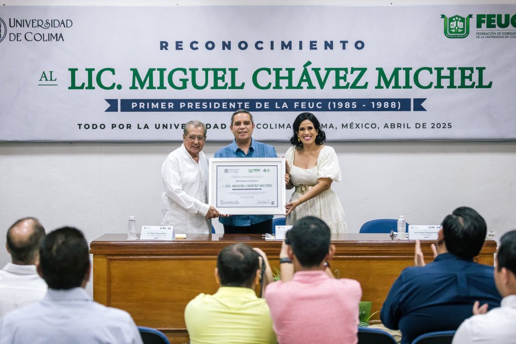 En el reconocimiento se lee que se le entrega a Miguel Chávez Michel “por su destacada trayectoria profesional”, por ser “un ejemplo de liderazgo, generosidad, lealtad por su alma máter, la Universidad de Colima, y por la FEUC. Su ejemplo continúa inspirando a quienes comparten su pasión por la educación, la historia y el servicio público”.