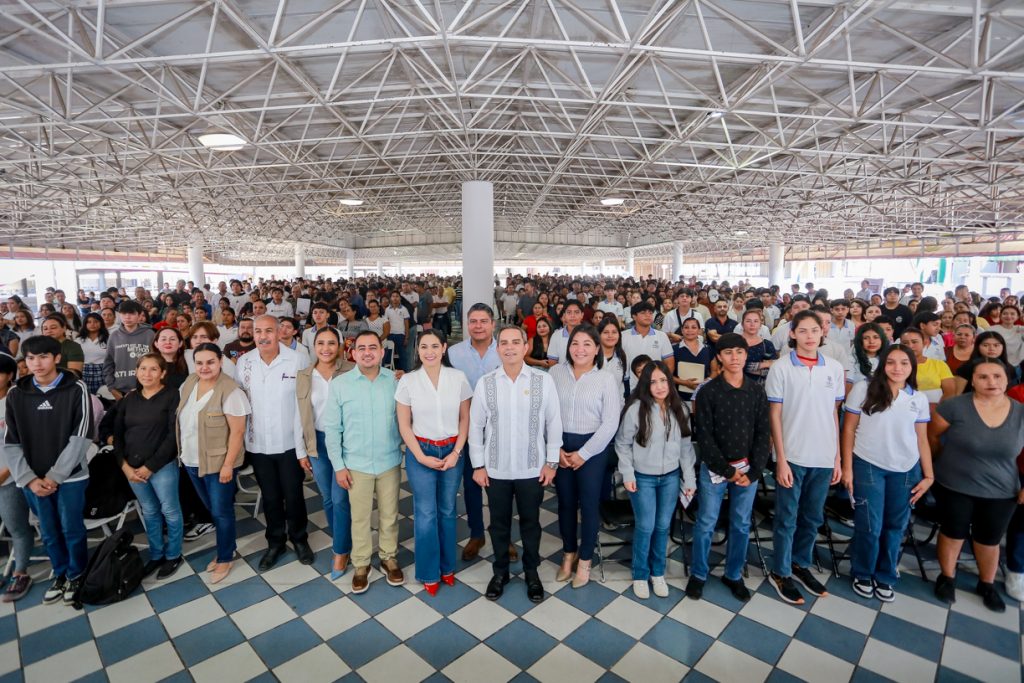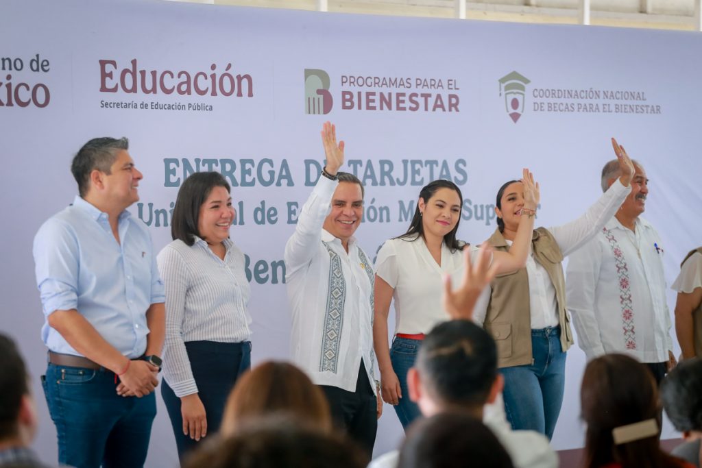 En las instalaciones de la Feria de Colima, la gobernadora del estado, Indira Vizcaíno Silva, acompañada por el Rector de la Universidad de Colima, Christian Jorge Torrez Ortiz Zermeño, encabezó la entrega simbólica de las tarjetas correspondientes a la Beca Universal para la Educación Media Superior “Benito Juárez”, dirigida a estudiantes de bachillerato y profesional técnico bachiller en escuelas públicas del estado.
