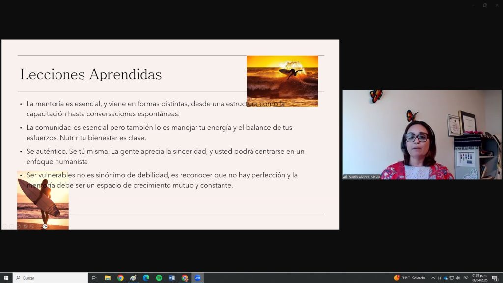 Respecto a la labor del mentor, enfatizó la importancia de establecer límites. “He aprendido a reservar un tiempo para los estudiantes, pero también para mí misma. En Estados Unidos, si una cita no es de urgencia, puede postergarse según la carga de trabajo. Es esencial que el mentor esté en condiciones adecuadas para atender al aprendiz”. Agregó que, si se aborda un tema sensible, se debe derivar a un experto. “Es válido decir: ‘No puedo trabajar en ese tema, mejor veámoslo con alguien más’. Además, si existe la posibilidad de malinterpretaciones, es preferible sostener las conversaciones en lugares abiertos”.