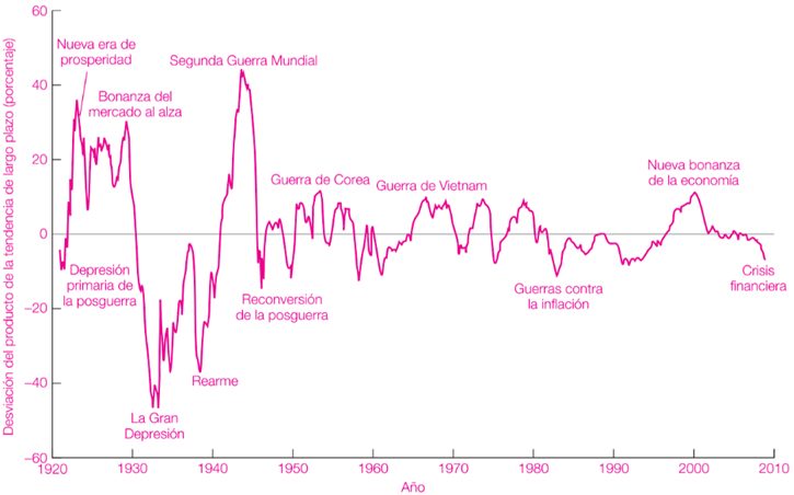 Aquí podemos observar cómo diversos factores influyen en las fluctuaciones económicas. Existen factores externos, como la Segunda Guerra Mundial, y factores internos, como la Gran Depresión. También podemos identificar todas las partes del ciclo económico que se mencionaron en la Imagen 1, así como la duración de cada ciclo, que coincide con la descripción inicial (de 2 a 10 años).