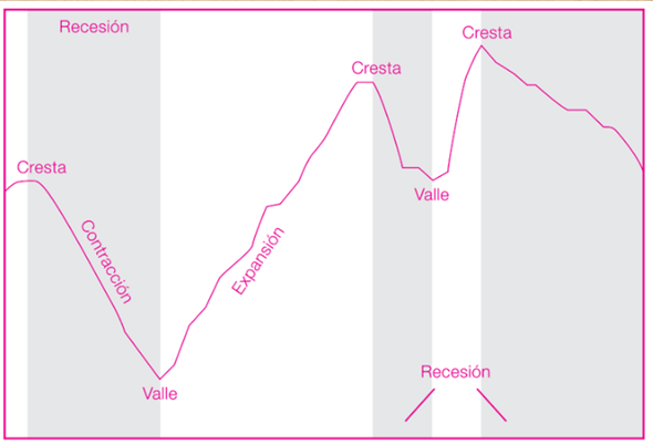 En esa imagen podemos observar claramente a qué nos referimos con recesión y expansión. Sin embargo, también se identifican otras partes del ciclo económico: la cresta y el valle.
