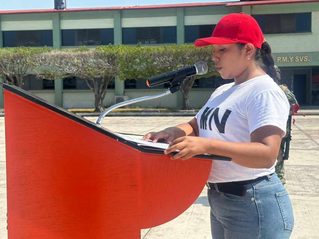 En su participación, la soldado voluntaria Adriana Elizabeth Mejía Pérez, quien en representación de sus compañeros pronunció un discurso destacando la fecha y también hizo un llamado a sus compañeros a ver en el Servicio Militar Nacional no solo una obligación, sino un verdadero deber cívico y moral, destacando que ahora es responsabilidad de su generación ser protagonista en la construcción de un México más fuerte y más unido.