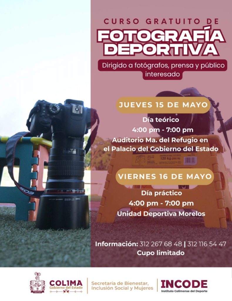 El Gobierno del estado de Colima, a través de la Secretaría de Bienestar, Inclusión Social y Mujeres y el Instituto Colimense del Deporte (Incode) invita a participar a las fotógrafas y los fotógrafos, personal de prensa y público interesado, en el curso gratuito de fotografía deportiva en sus partes teórica y práctica, que se efectuará jueves 15 y viernes 16 de mayo.
