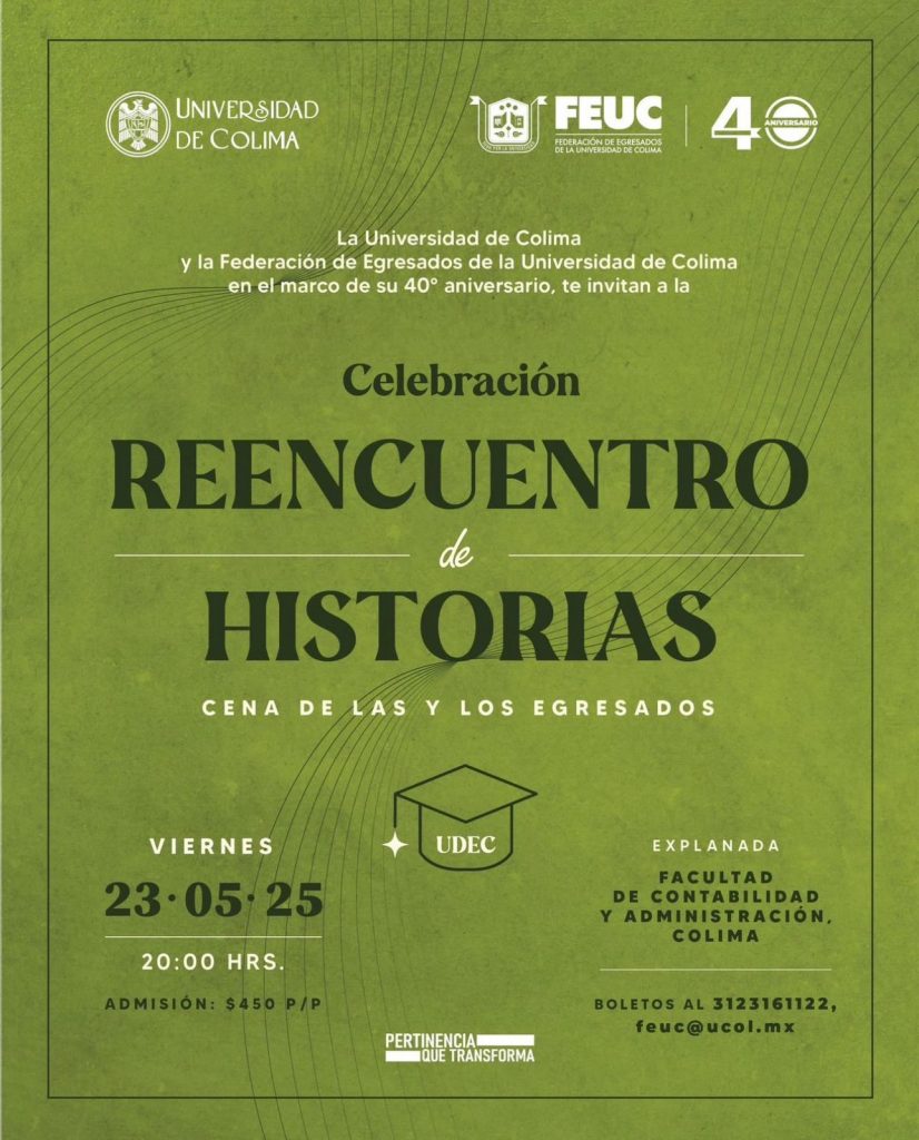 Con el propósito de fortalecer los lazos entre la Universidad de Colima (UdeC) y su comunidad de egresadas y egresados, la Federación de Egresados de la Universidad de Colima (FEUC), en el marco de su 40 aniversario, invita a participar en la tradicional cena “Reencuentro de historias”, para celebrar la identidad, pertenencia y el orgullo universitario.