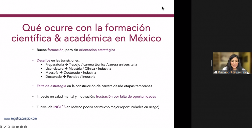 Como experta en México y Latinoamérica, resaltó que se tienen desafíos como la falta de orientación estratégica al momento de construir las carreras en fases tempranas, y explicó que, a nivel de prepa, los jóvenes no saben si al terminarla se irán a trabajar o si al terminar su carrera harán una carrera científica. “En licenciatura tienen duda sobre si al concluirla hacen una maestría, se van a la parte clínica, a la industria. Si terminaron un posgrado dudan en irse a la industria y de igual forma seguir con algún post doctorado”, comentó.