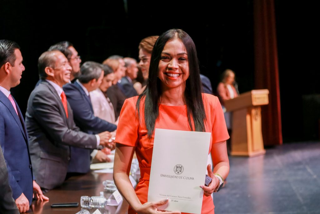 En nombre de las y los homenajeados, la profesora-investigadora Ciria Margarita Salazar, quien recibió reconocimiento por 25 años de labor en está institución, comentó que la Universidad de Colima se ha convertido en su segunda casa. “Aquí hemos compartido no solo tiempo y conocimiento, sino también sueños, anhelos y esperanzas. La esperanza de formar a mejores personas, porque hemos constatado a lo largo de nuestro caminar por la Universidad, que la educación es la mejor tecnología para la transformación y el desarrollo, y que a través de ella podemos aspirar, genuinamente, a ser personas felices”.