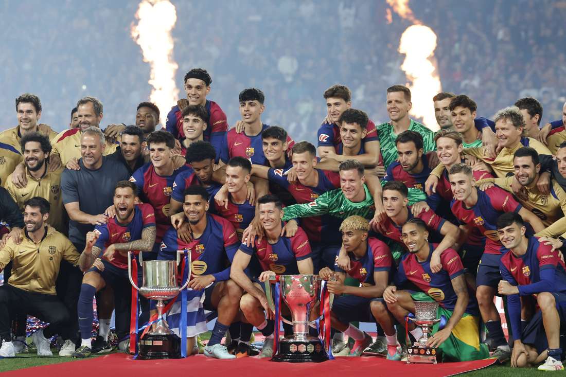 El festejo arrancó tras la finalización del partido con la entrega del trofeo por parte del presidente de la Real Federación Española de Futbol (RFEF), Rafael Louzán, acompañado por el presidente del Barcelona, Joan Laporta, que se unió a la celebración de los futbolistas cuando el capitán Marc-André ter Stegen levantó la copa.