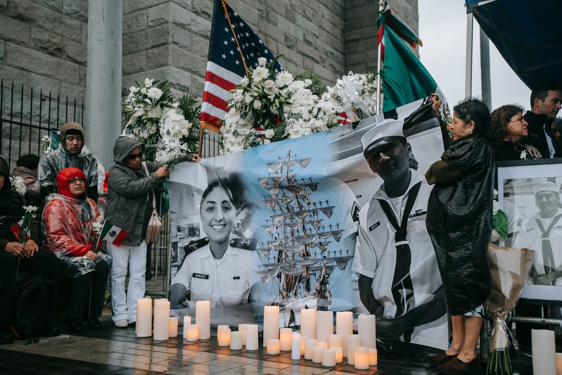 Centenares de mexicanos se reunieron en una vigilia en Nueva York por las víctimas del accidente del Buque Escuela Cuauhtémoc, que impactó el sábado contra el icónico puente de Brooklyn dejando 2 cadetes fallecidos y una veintena de heridos.