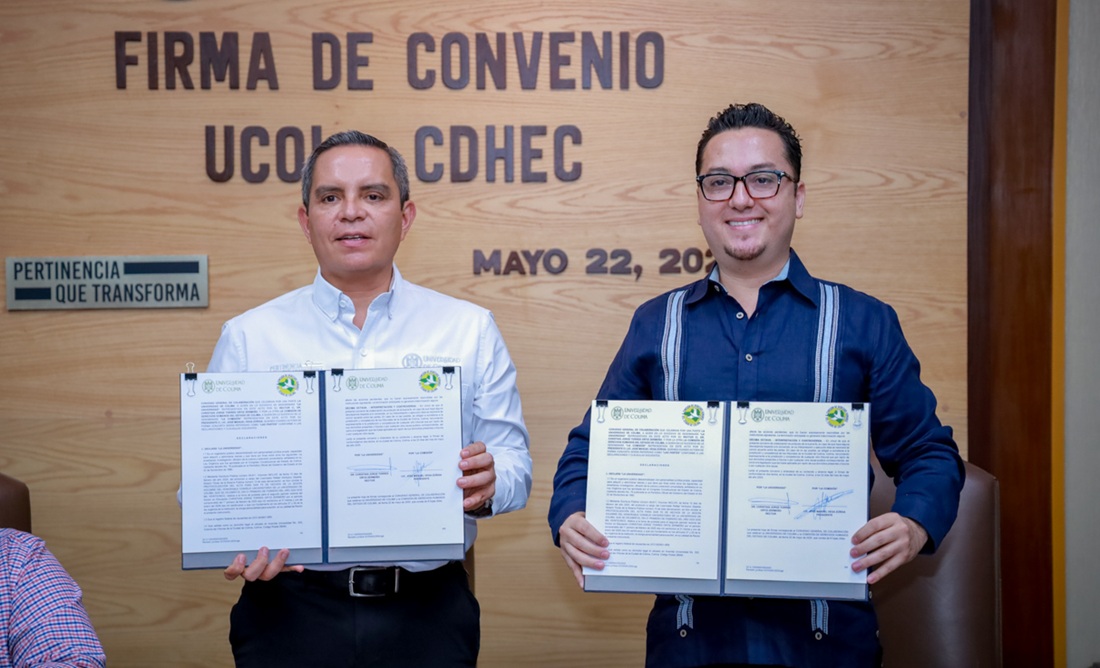 En la Sala de Juntas de Rectoría, la Universidad de Colima (UdeC) y la Comisión de Derechos Humanos del Estado de Colima (CDHEC) firmaron un convenio de colaboración para formalizar acciones de mejora continua, educación continua, certificación de competencias, servicios sociales y prácticas profesionales, cultura de paz y derechos humanos, innovación tecnológica, emprendimiento con perspectiva de derechos humanos y vinculación entre ambas instituciones.