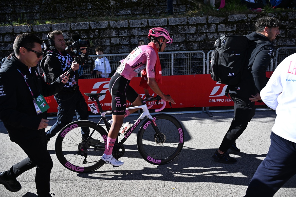 De inicio la carretera cuesta arriba, muchos ataques y Juan Ayuso penando a cada pedalada, perdiendo tiempo a las primeras de cambio, hundido en un grupo retrasado. La fuga tardó en formarse, pero al final se marcharon subiendo el Tonale (2a, 15.2 km al 6.1%) 38 corredores.