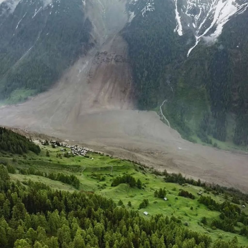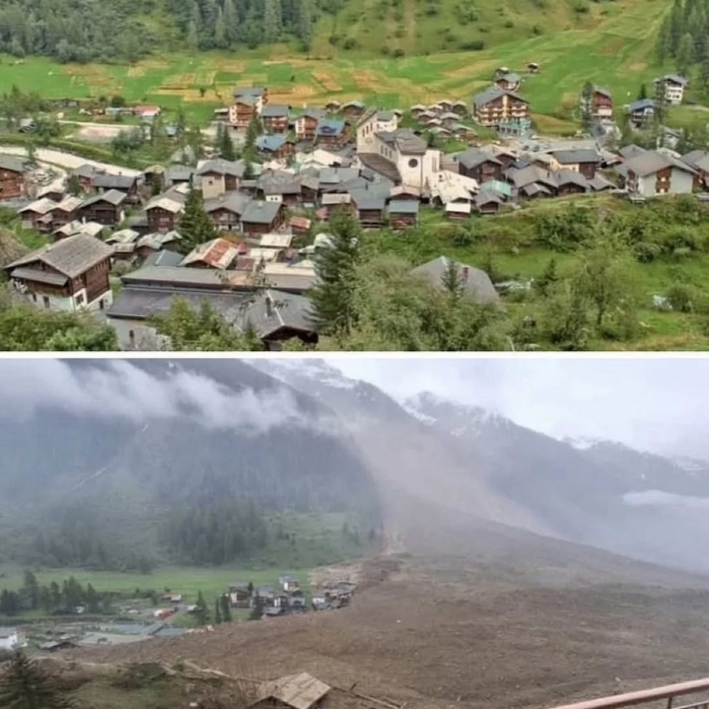 El deslizamiento, de una violencia devastadora, arrasó con el 90% del casco urbano e implicó el desprendimiento de unos 35 millones de metros cúbicos de material que descendió la ladera a una gran velocidad, bloqueando además el curso del río Lonza, según informaciones transmitidas desde el lugar por la televisión pública suiza RTS.