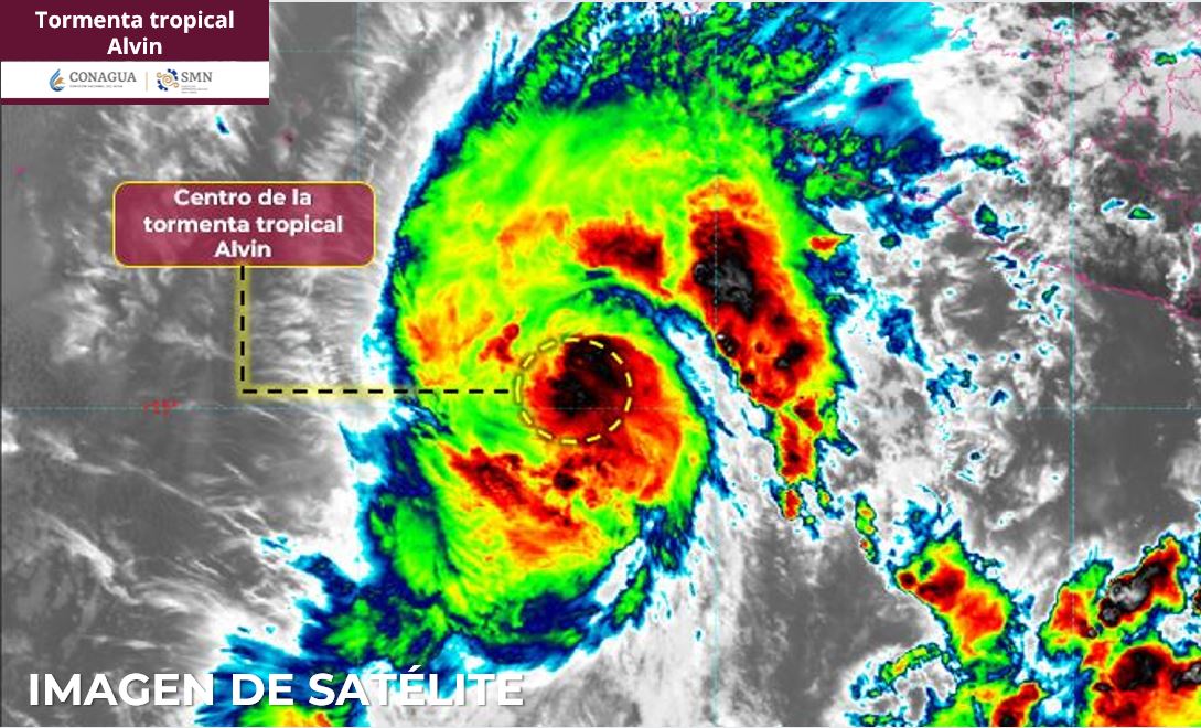 El Servicio Meteorológico Nacional (SMN) informó que la tormenta tropical Alvin se ha fortalecido al sur de las costas de Jalisco y Colima. A las 3:15 de la tarde, el fenómeno se ubicaba a 535 km al suroeste de Manzanillo, Colima, y a 910 km al sur-sureste de Cabo San Lucas, Baja California Sur, y se desplaza a razón de 19 kilómetros por hora (km/h) hacia el noroeste, con vientos máximos sostenidos de 95 km/h y rachas de 110 km/h.
