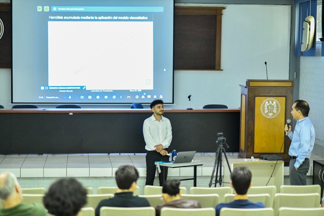 Mecánica de Fluidos y Medicina. Aquí, Christian Birrueta presentó el proyecto “Análisis mediante dinámica de fluidos computacional del riesgo de hemólisis en cánula de doble lumen neonatal para la oxigenación por membrana extracorpórea venovenosa”.