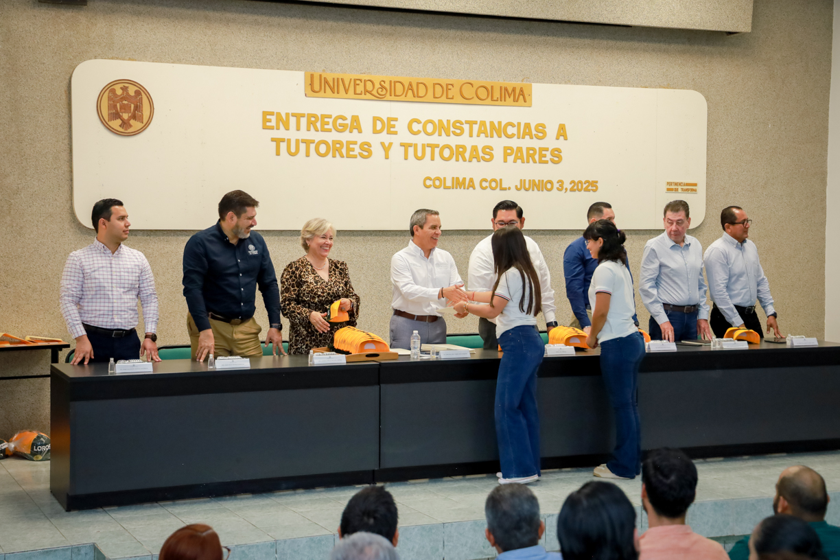 El Rector de la Universidad de Colima, Christian Torres Ortiz Zermeño, entregó en el Auditorio “Carlos Eduardo Monroy” de la Facultad Psicología, 212 constancias a estudiantes de nivel medio superior y 118 a jóvenes de nivel superior del programa Tutoras y Tutores Pares, que coordina la Dirección General de Orientación Educativa y Vocacional de esta Casa de Estudios.