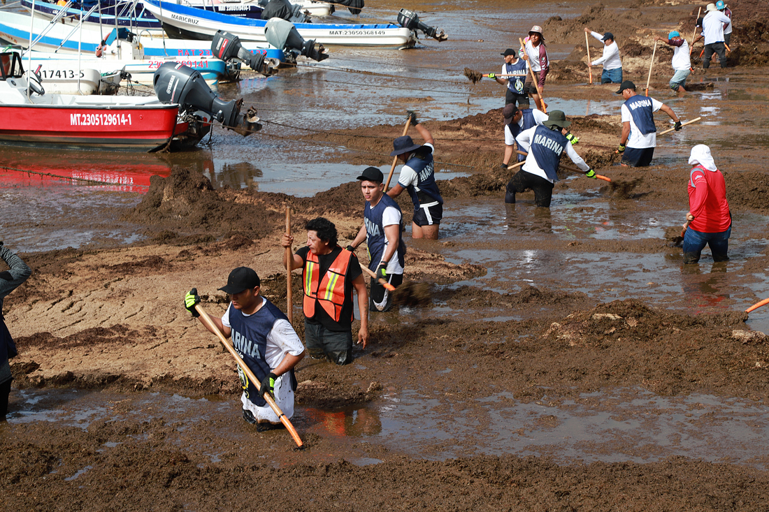 Los niveles excesivos de sargazo que recalan en playas como El Recodo y Punta Esmeralda obligaron a un operativo emergente en el que participan efectivos de la Secretaría de Marina y de dependencias estatales y municipales, pero también de infractores menores que optaron por permutar los días de cárcel con labores de limpieza en las playas.