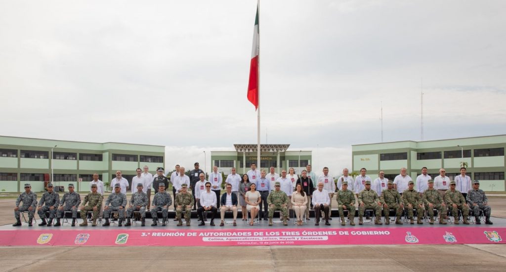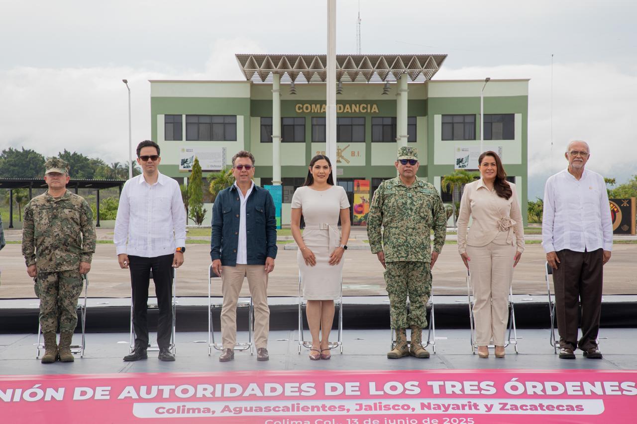 La gobernadora Indira Vizcaíno Silva recibió en la Vigésima Zona Militar de Colima, a la mandataria de Aguascalientes, María Teresa Jiménez Esquivel; los gobernadores Pablo Lemus Navarro de Jalisco y Miguel Ángel Navarro Quintero de Nayarit, así como a Rodrigo Reyes Mugüerza, Secretario General del Gobierno de Zacatecas, y demás autoridades que participaron en la Tercera Reunión de Autoridades de los Tres Órdenes de Gobierno.