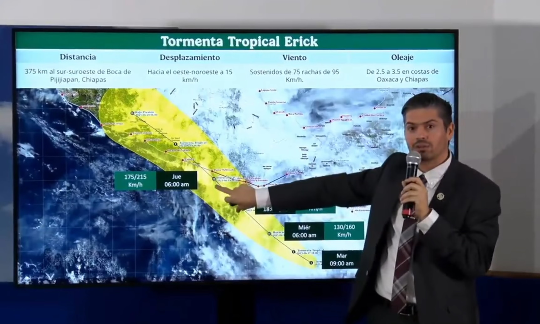 El coordinador general de Conagua, Fabián Vázquez Romaña, explicó en una conferencia de prensa que se espera que Erick, que se formó el lunes como tormenta tropical, evolucione rápidamente a ciclón e impacte las costas en Oaxaca y Guerrero entre la noche del miércoles y las primeras horas del jueves.