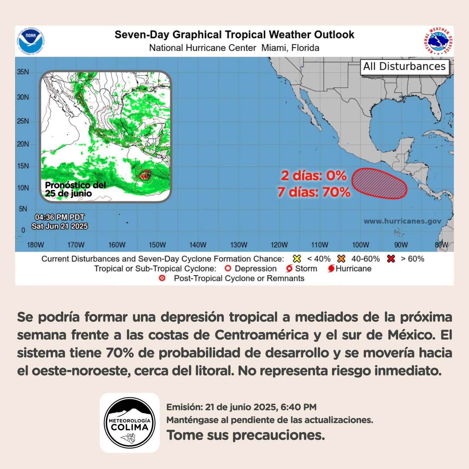El sistema podría desplazarse hacia el oeste-noroeste, muy cerca de las costas del Pacífico centroamericano y mexicano, sin que por el momento se prevea un impacto directo en Colima.