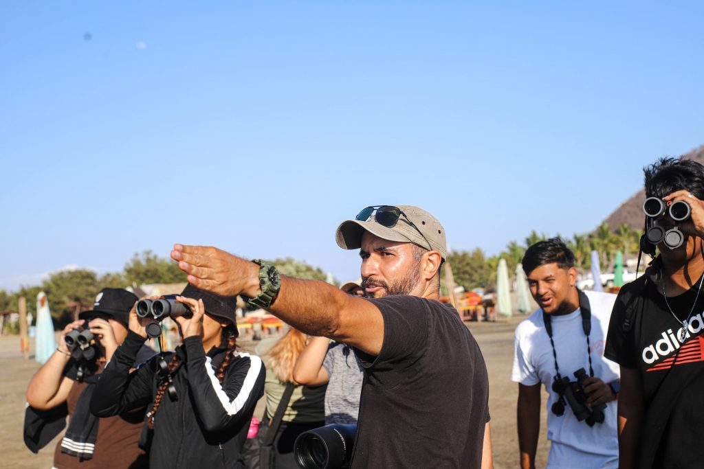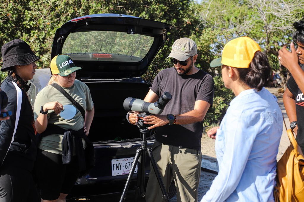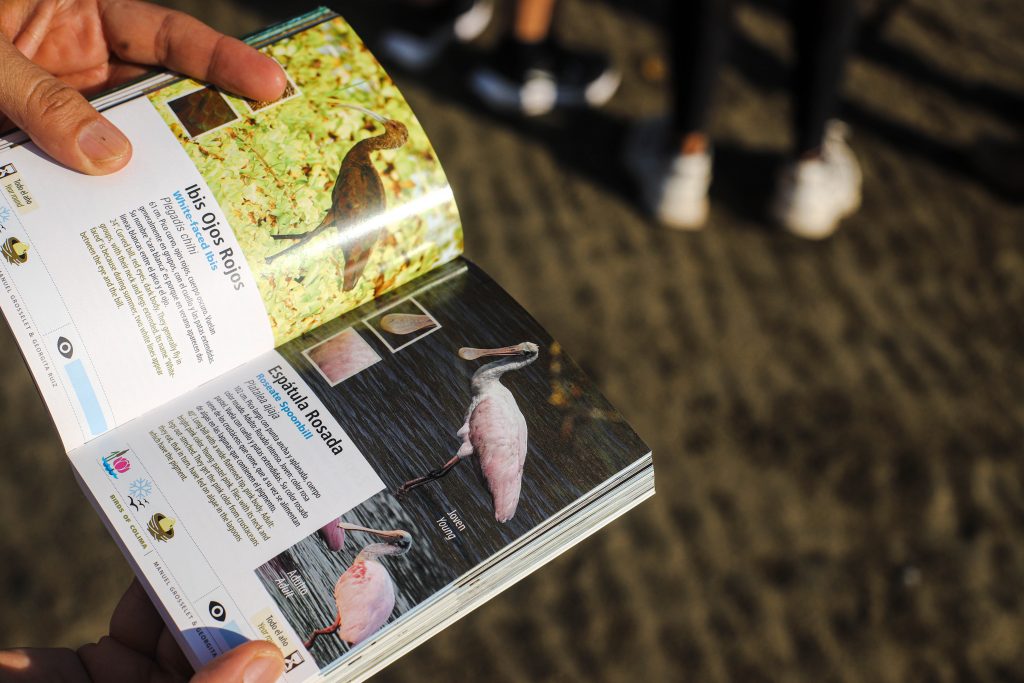Luego de una introducción sobre cómo utilizar el equipo, el experto fue señalando las aves que se acercaban, como Las fragatas (Fregata magnificens), Pelícano café (Pelecanus occidentalis), Charranes (Laridae) y la “spátula rosada (Platalea ajaja), y pidió al alumnado registrar los detalles de esos animales como el pico, sus exóticos plumajes, el color de sus ojos, tamaños y comparaciones entre hembras y machos.