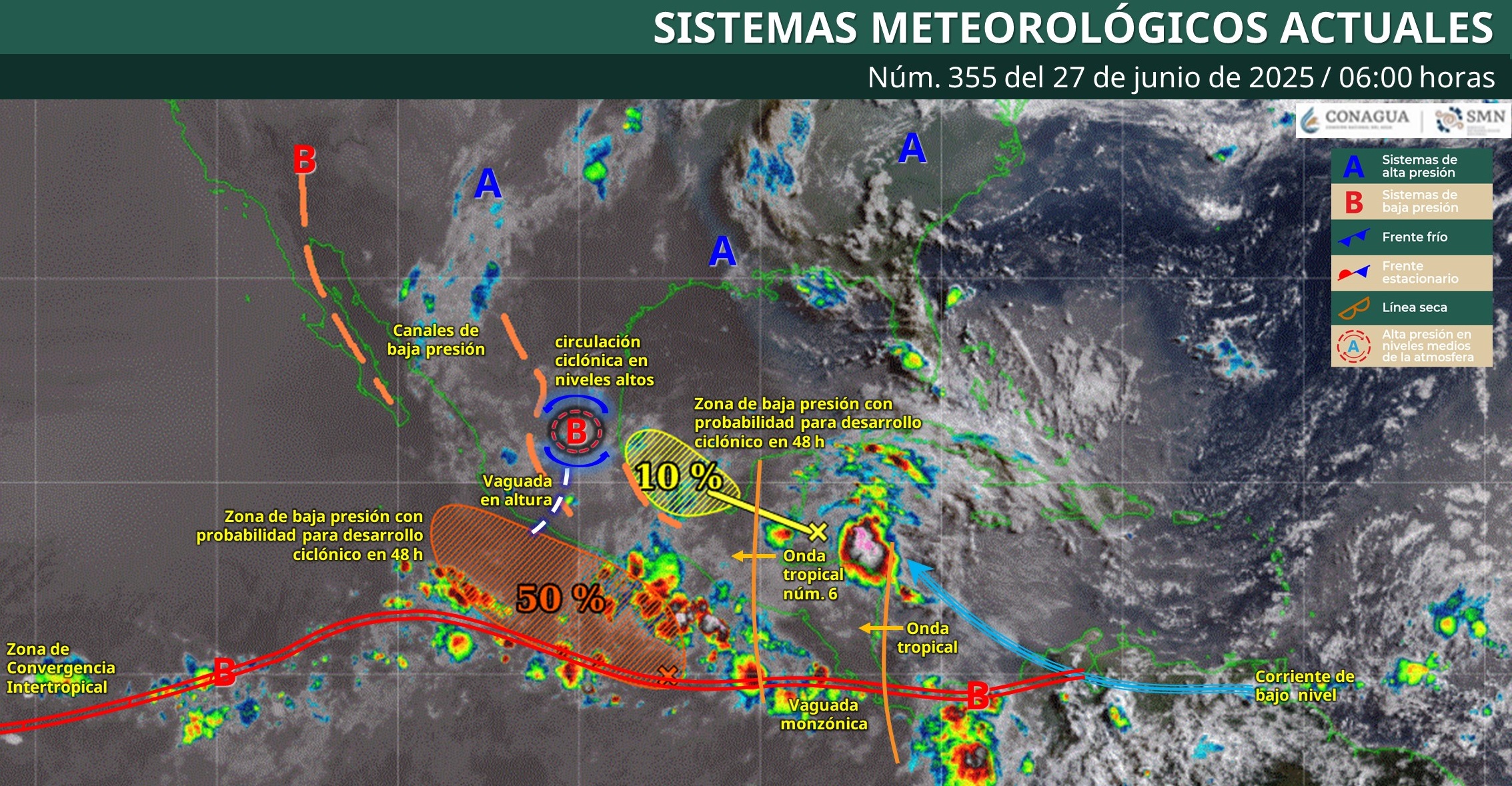 La onda tropical número 6 será absorbida por una zona de baja presión con potencial ciclónico en el Pacífico, que se desplazará al sur de Oaxaca y Chiapas. Este sistema, junto con un canal de baja presión en el sureste y el ingreso de humedad desde el Pacífico, el golfo de México y el mar Caribe, ocasionará lluvias puntuales intensas en estados como Veracruz, Oaxaca, Chiapas, Tabasco, Campeche y Quintana Roo, así como lluvias muy fuertes en Yucatán.