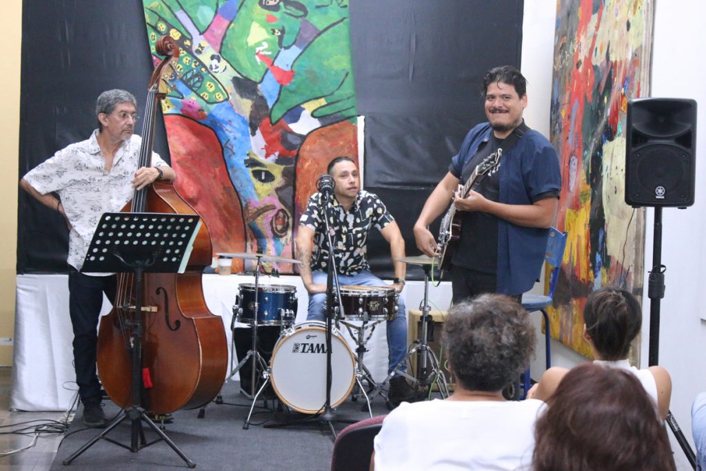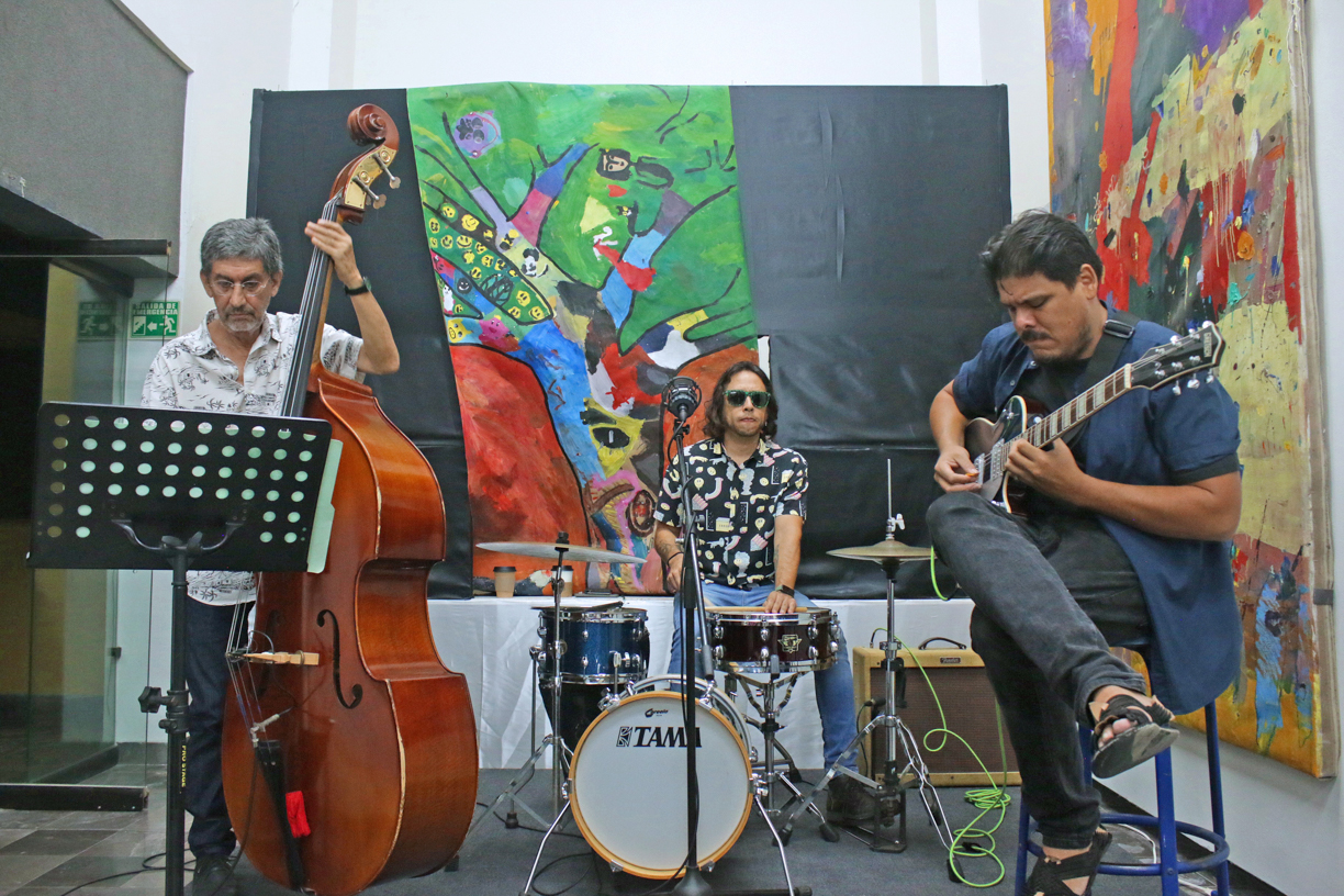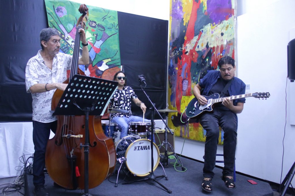 En un ambiente íntimo y cercano con el público, se presentó en la Pinacoteca Universitaria el concierto “Volumen B”, del grupo Gil Moreno Trío, propuesta musical de jazz fusión que cuenta con la participación de Miguel Ángel de la Mora en el contrabajo, Ricardo Guzmán en la batería y Gilberto Moreno en la guitarra, así como piezas compuestas por este último.