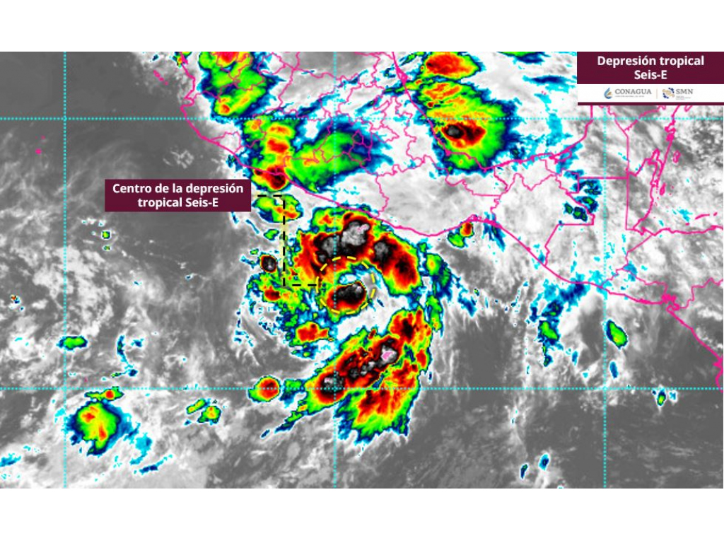 La depresión tropical Seis-E, ubicada a 370 kilómetros al sur-suroeste de Punta Maldonado, Guerrero, y a 410 kilómetros al sur de Acapulco, continúa su proceso de intensificación mientras se desplaza hacia el oeste a una velocidad de 19 km/h, informó el Servicio Meteorológico Nacional (SMN).