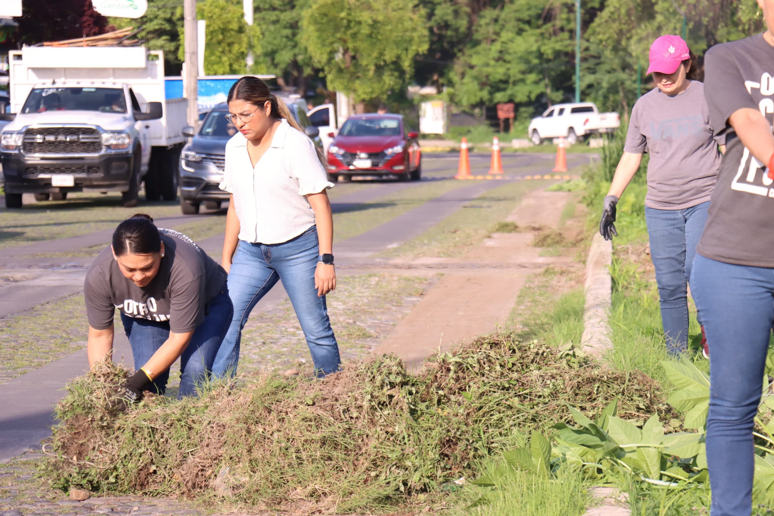 Durante la actividad, personal de diversas áreas municipales realizó el retiro de maleza en banquetas y machuelos, poda de ramas, recolección de residuos vegetales y limpieza general.
