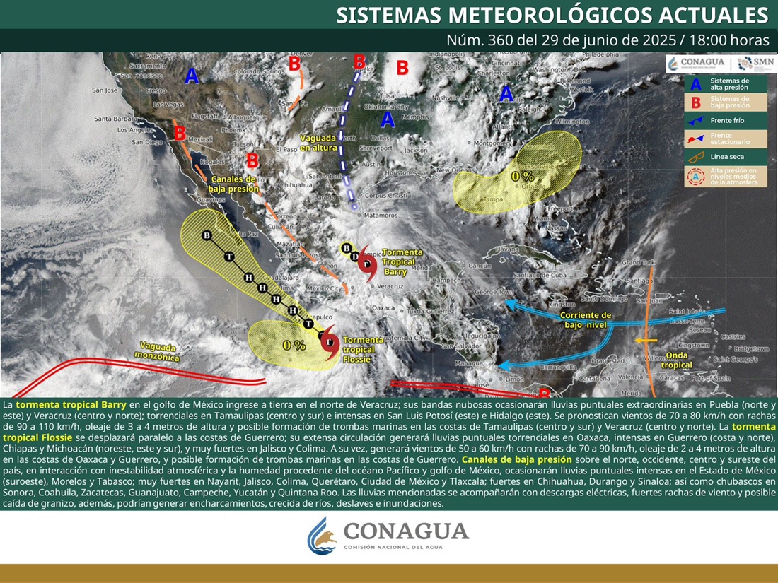 Las tormentas tropicales Barry y Flossie están generando condiciones meteorológicas adversas en diversas regiones del país, con lluvias intensas a torrenciales, fuertes vientos y oleaje elevado, según el reporte del Servicio Meteorológico Nacional (SMN).