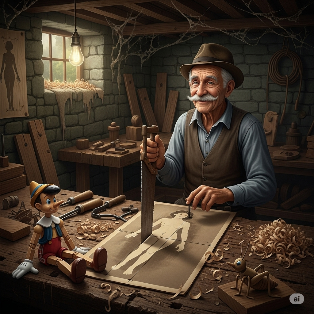 Se dirigió a la cueva, donde tenía su taller, tras una puerta que conducía a un sótano totalmente húmedo y con olor rancio. Sacó, desde una bolsa que pendía del acomplejado techo, una fotografía de una mujer desnuda en cuerpo entero, con algunos trazos de medidas encima. Postró su figura sobre un banco ancestral de madera. Empezó a cortar, una por una, cada una de las piezas replicadas en madera, y siguió al armado del cuerpo de quien sería la compañera de su hijo: Pinocho.