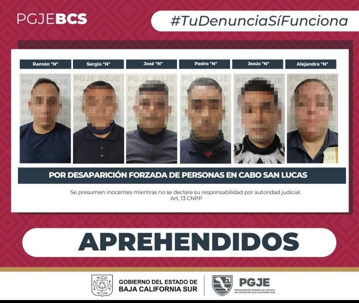 Autoridades navales y de la Procuraduría General de Baja California Sur detuvieron a 6 elementos de la Policía Municipal de Los Cabos, por su presunta participación en la desaparición forzada de 2 jóvenes.