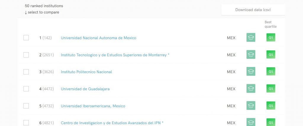 En la edición más reciente del SCImago Institutions Rankings (SIR) 2025, la Universidad Nacional Autónoma de México (UNAM) se consolida como la mejor institución del país, al encabezar la lista de las 50 universidades mexicanas evaluadas e incorporadas en este ranking. En este mismo ranking, la Universidad de Colima (UdeC) alcanzó el puesto número 13 a nivel nacional, posicionándose además como la segunda mejor universidad del occidente de México en cuanto a su desempeño en investigación científica.