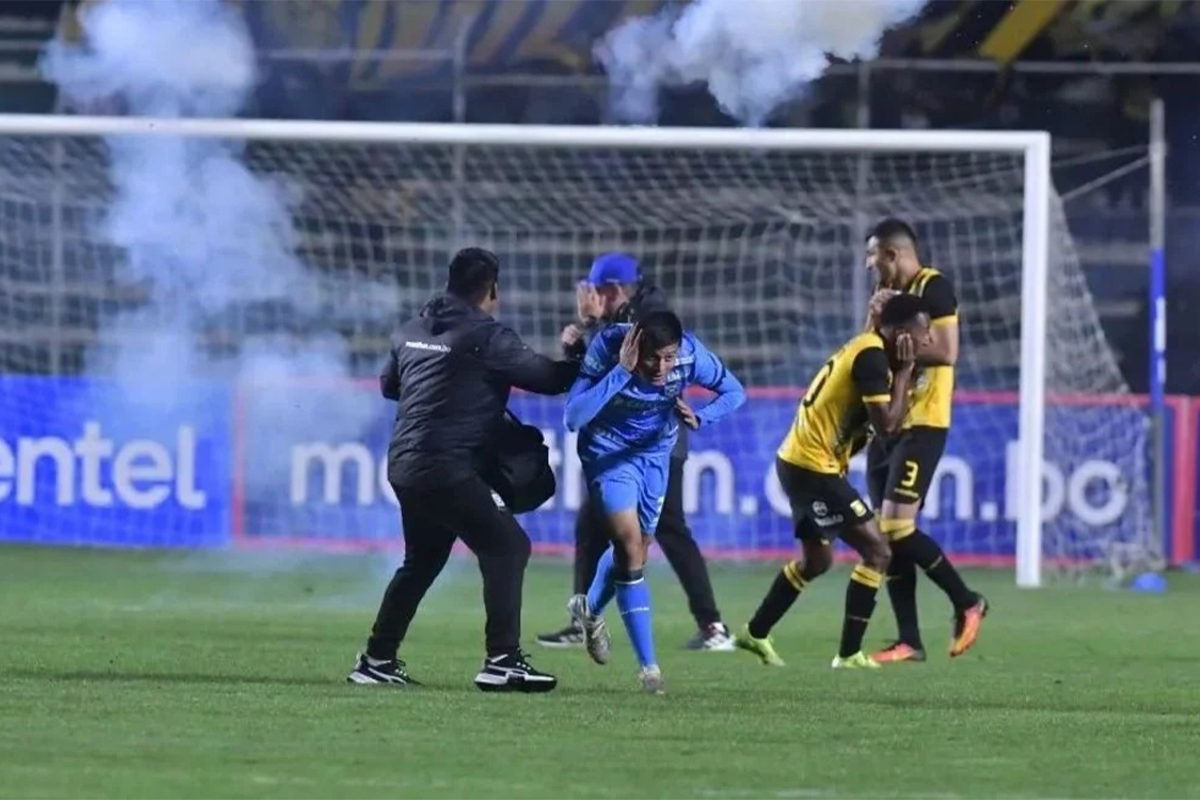 Desde la grada de la barra brava de The Strongest comenzaron a lanzarse petardos y bengalas directamente hacia la cancha justo cuando había un tiro libre a favor de los aurinegros cerca del área de la visita.