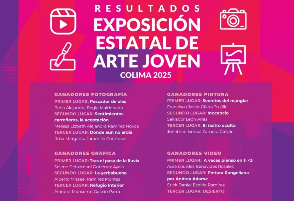 La Subsecretaría de Cultura estatal, en coordinación con la Secretaría de Cultura del Gobierno de México, informó los resultados de la convocatoria para la exposición “Arte Joven Colima 2025”, conformada por 37 obras de pintura, fotografía, gráfica y video, seleccionadas entre 100 propuestas.