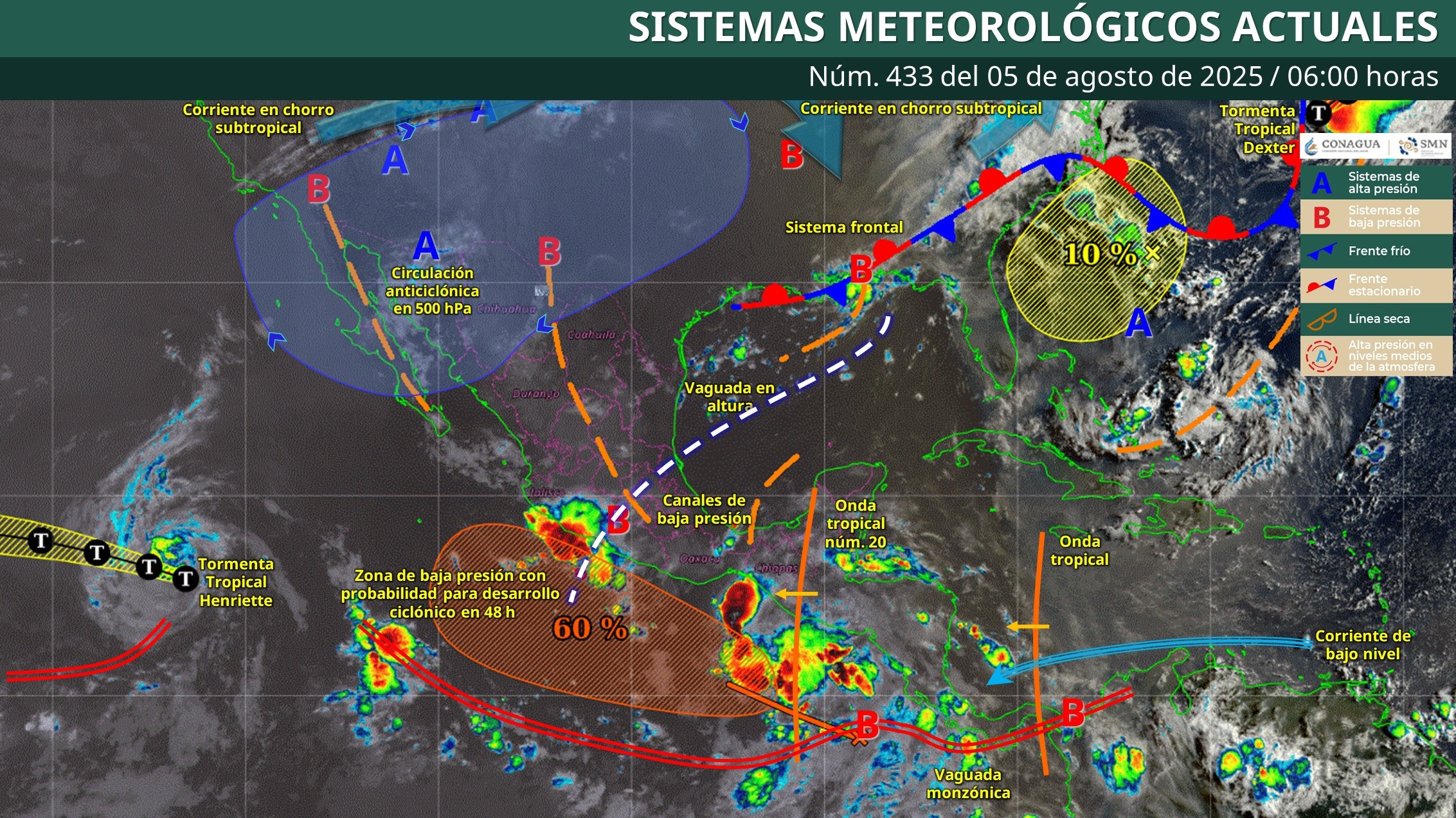 De acuerdo con el pronóstico del Servicio Meteorológico Nacional (SMN), una vaguada en altura sobre el occidente del territorio nacional, en combinación con el ingreso de aire húmedo proveniente del océano Pacífico y el golfo de México, generará condiciones inestables en la región. En Colima, las lluvias podrían alcanzar acumulaciones de entre 25 y 50 milímetros, lo que podría derivar en incremento en niveles de ríos y arroyos, deslaves e inundaciones en zonas susceptibles.
