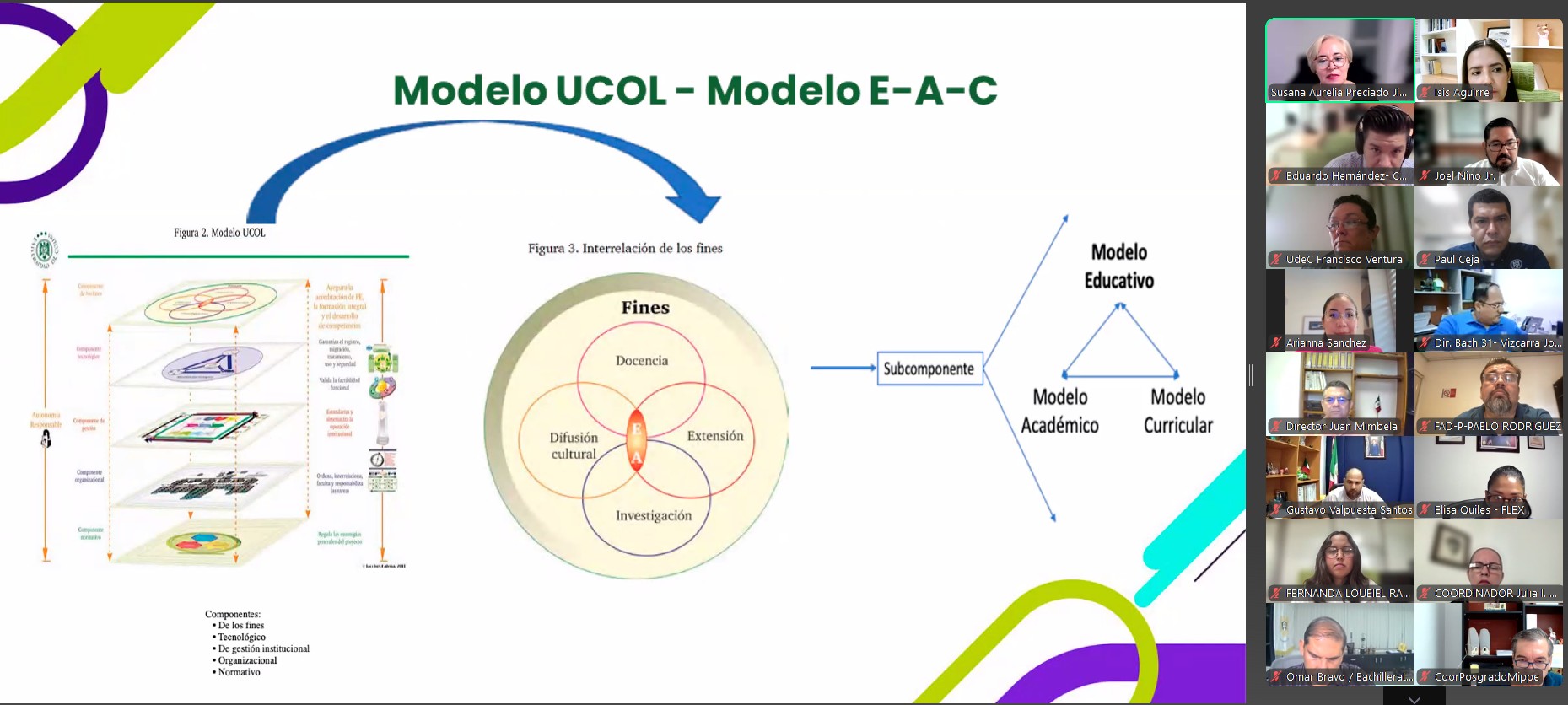 El modelo educativo, comentó, es el marco de referencia que establece los fundamentos filosóficos, epistemológicos, profesionales y psicopedagógicos de la educación en una institución. Dentro de este modelo, destacó la presencia de 2 componentes clave: el modelo académico en sí y el modelo curricular.