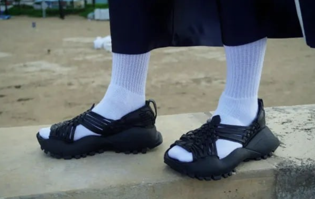 El diseño de Chavarría utiliza el huarache tradicional de cuero con el tejido clásico cruzado y lo mezcla con una suela alta tipo sneaker, parte de la estética de Adidas.