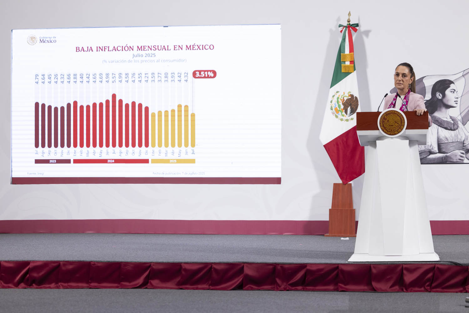 La presidenta Claudia Sheinbaum celebró que la inflación haya bajado a 3.51% en julio, hilando su segundo mes consecutivo a la baja.