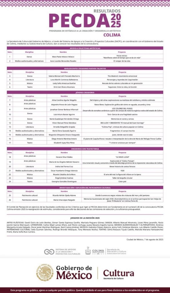La Subsecretaría de Cultura, en coordinación con la Secretaría de Cultura del Gobierno de México, publica la lista de los 26 proyectos que recibirán incentivos económicos de hasta 70 mil pesos, a través del Programa de Estímulos a la Creación y Desarrollo Artístico (PECDA) Colima 2025, para realizar obras y propuestas creativas en teatro, danza, música, literatura, artes plásticas, medios audiovisuales y alternativos, y proyectos de rescate y difusión del patrimonio cultural.