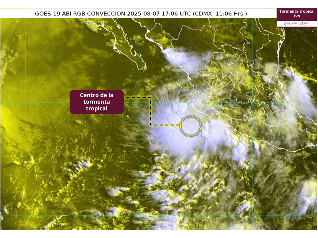 De acuerdo con el reporte de las 12 del mediodía de este jueves 7 de agosto del SMN, Ivo se ubicaba a 130 kilómetros al sur de Playa Pérula, Jalisco, y a 700 kilómetros al sureste de Cabo San Lucas, Baja California Sur. Presenta vientos sostenidos de 75 kilómetros por hora, con rachas de hasta 95 km/h, y se desplaza a una velocidad de 39 km/h.