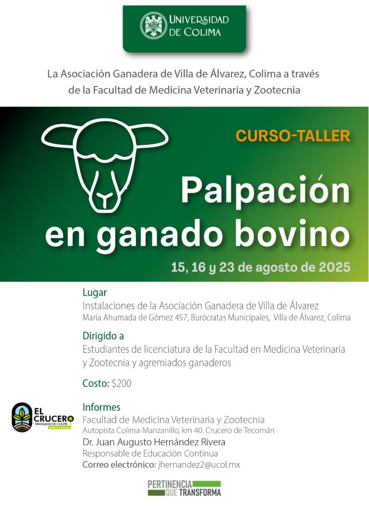 Con el objetivo de fortalecer las capacidades técnicas del sector ganadero y brindar formación práctica a sus estudiantes, la Asociación Ganadera local de Villa de Álvarez, en coordinación con la Facultad de Medicina Veterinaria y Zootecnia (FMVZ) de la Universidad de Colima, impartirán el Curso “Palpación en ganado bovino” los días 15, 16 y 23 de agosto.