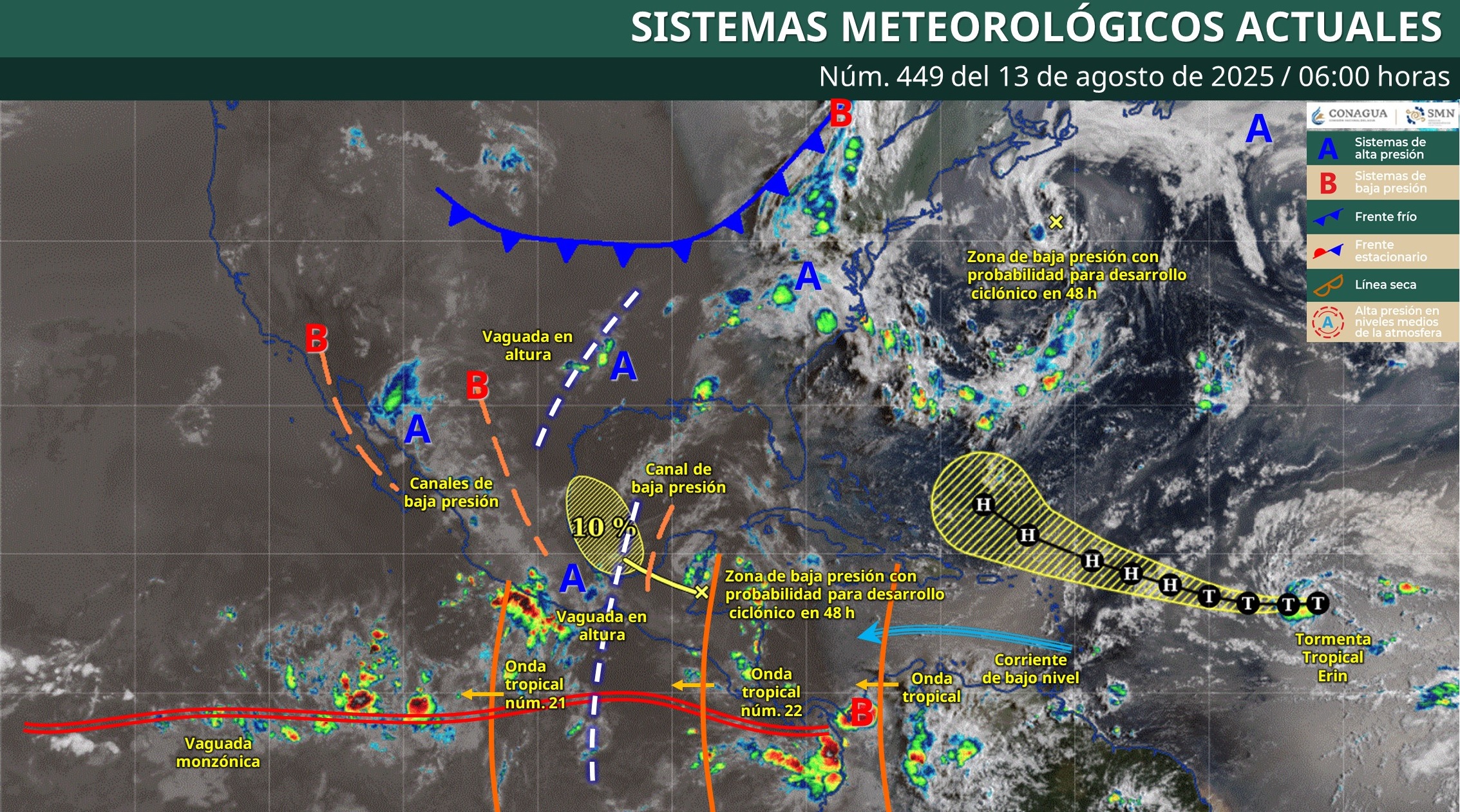 El organismo informó que las precipitaciones podrían provocar incremento en los niveles de ríos y arroyos, así como deslaves, inundaciones y encharcamientos, además de rachas de viento que, en el caso de Colima, oscilarán entre 30 y 40 kilómetros por hora, con ambiente cálido durante la tarde.
