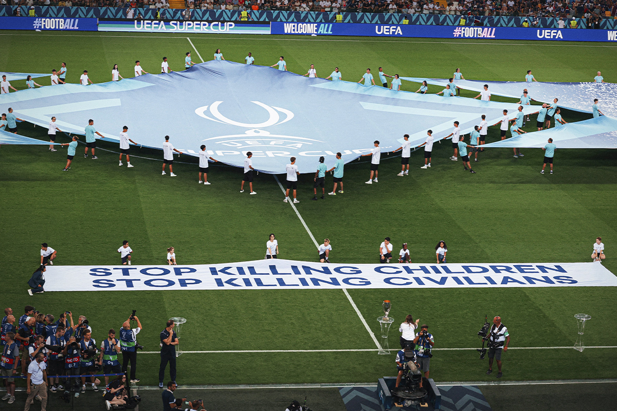 La UEFA desplegó, antes del inicio de la Final de la Supercopa de Europa entre PSG y Tottenham, una pancarta gigante en la que, aunque sin mencionar al país, dirigió un mensaje a Israel por su conflicto abierto con Palestina: “Dejar de matar niños, dejar de matar civiles”.