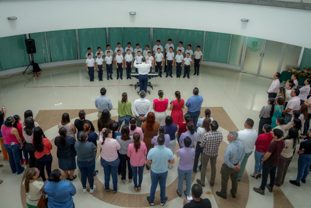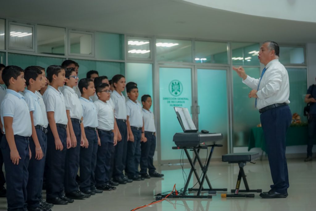 Los Niños Cantores de la Universidad de Colima se presentaron en el Edificio Administrativo y Financiero del Campus Central, como parte de una serie de actividades que realizan la Dirección General de Recursos Humanos y la Dirección General de Difusión Cultural, con los objetivos de que los trabajadores conozcan los grupos universitarios y las actividades culturales, y que salgan de su rutina laboral.
