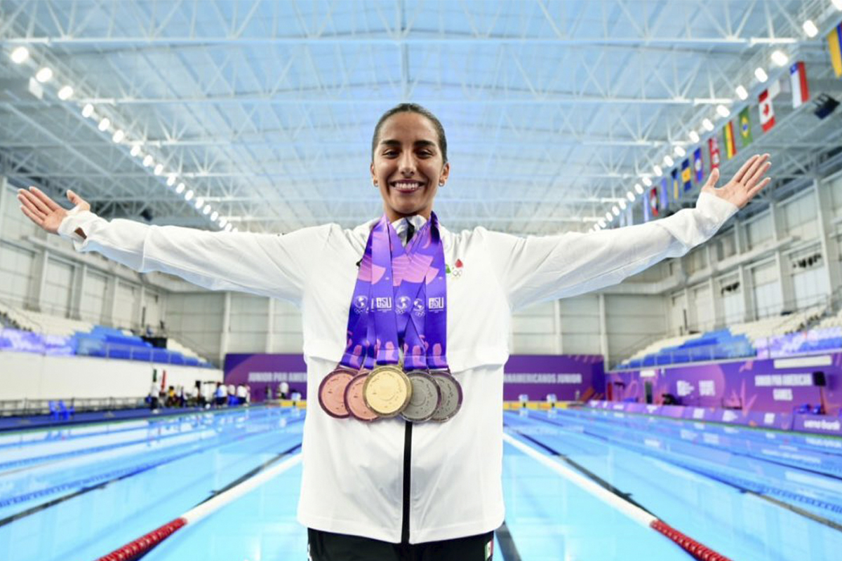 La mexicana obtuvo Oro en 100m dorso; 2 platas en 200m dorso y en Relevo femenil 4x100m libre; y 2 bronces Relevo mixto 4x100m libre y Relevo femenil 4x100m combinado.