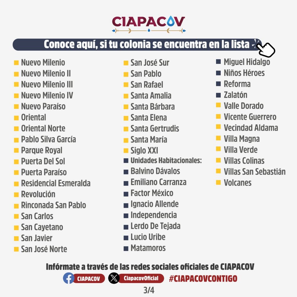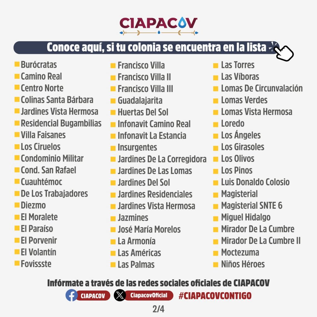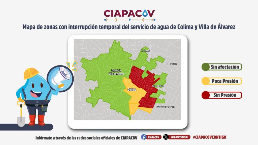 Vladimir Parra, director de la Comisión Intermunicipal de Agua Potable y Alcantarillado Colima-Villa de Álvarez (Ciapacov), informó en una conferencia de prensa que, debido a los trabajos de reubicación de 700 metros del acueducto Zacualpan por la construcción del Arco Norte, el suministro de agua potable en el municipio de Colima operará de manera parcial del miércoles 20 al viernes 22 de agosto.